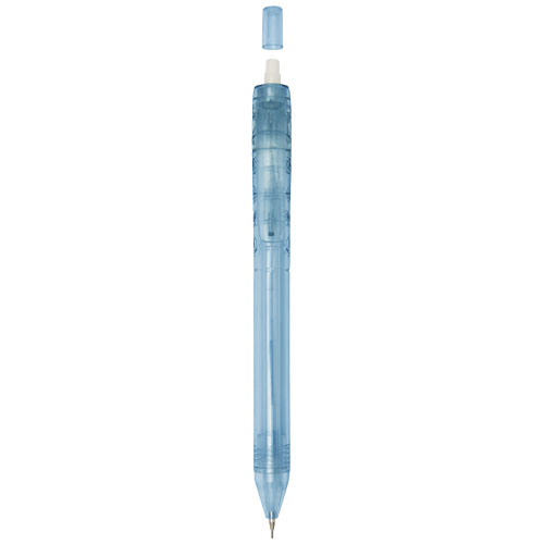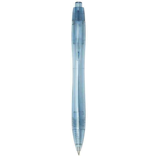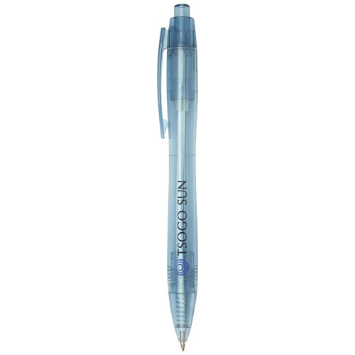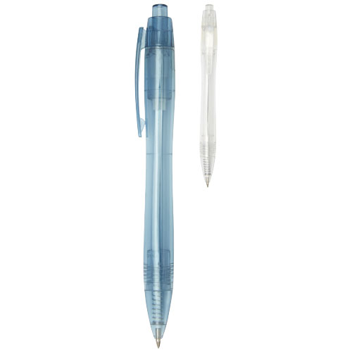 Kulepenn med klikkmekanisme og en gjennomsiktig sylinder. Sylinderen er laget av resirkulerte vannflasker, noe som bidrar til å redusere mengden av plastavfall.