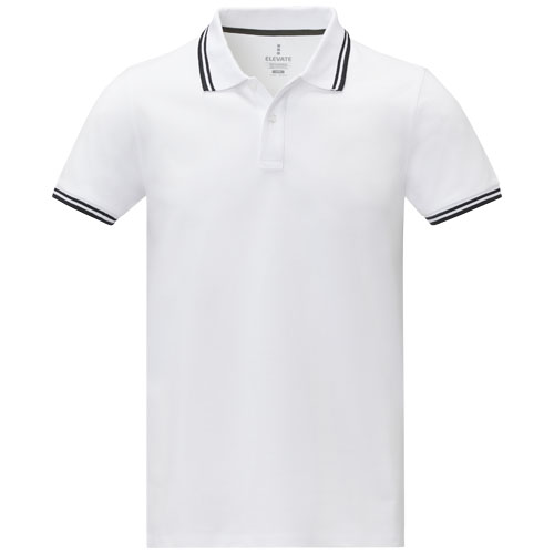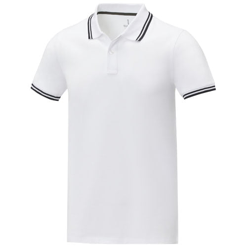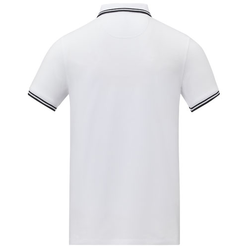 Flat strikket krage. Flat strikkede ribbemansjetter. Kontrastfarget stripe på krage og ermer. To knappestolper. Punktsømdetaljer. Nakketape i sateng. Sideåpninger med finish av satengtape. Halvmåne. Fremre skuldersøm med kjedesøm. Farget for å matche knappene. Hovedmerkelapp for transfer trykk og høyeste komfort.