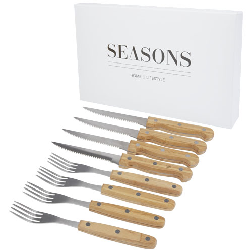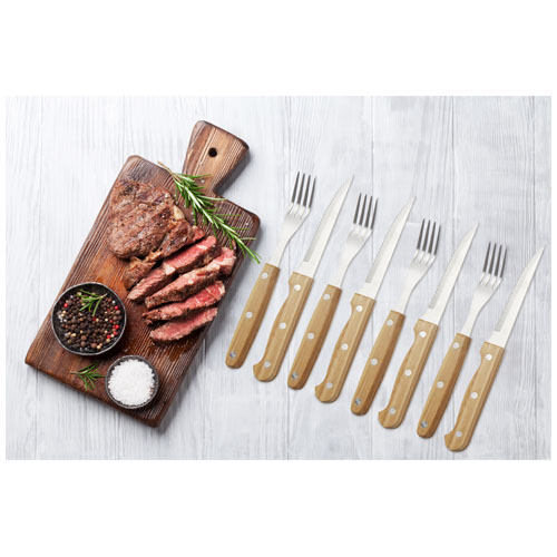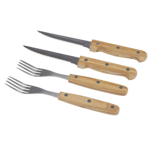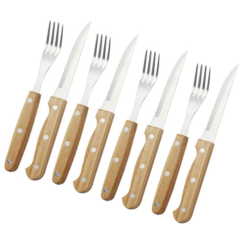 Bestikksett med 8 deler. Består av 4 biffkniver 21,2 x 2 cm og 4 biffgafler 19,8 x 2,1 cm . Helt nødvendig for helgens gourmetmiddager, skjær biffen med stil. Håndtakene er laget av bambus som er høstet og produsert etter bærekraftige standarder.