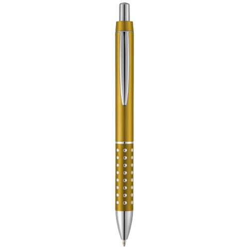 Kulepenn med trykkmekanisme og aluminiumsgrep med skinnende detaljer.