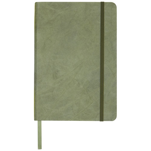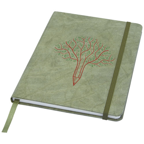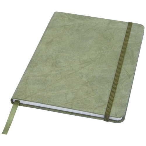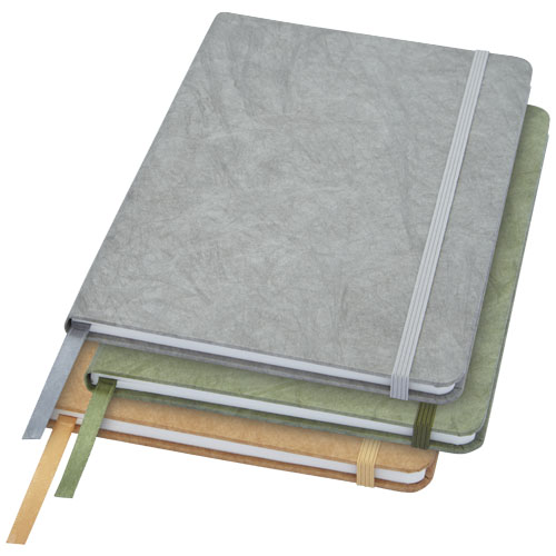 A5 størrelse rivebestandig notatblokk med ark laget av stein. Steinpapir er 100 trefritt, og produksjonsprosessen bruker mindre energi sammenlignet med resirkulert eller nytt tremassepapir. Det er vanntett slik at væskesøl lett kan tørkes av. Har en fargetilpasset båndmarkør, elastisk bånd og 60 ark av 120 g m linjert steinpapir. Pakket i et papp etui.