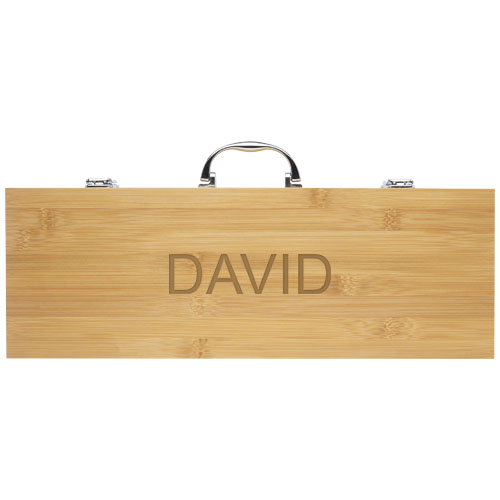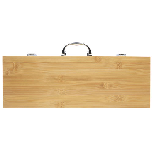5-delers grillsett av bambus med en spade 40 x 9,5 cm , tang 34,5 x 6 cm , gaffel 38,5 x 3 cm , kniv 38,5 x 3 cm og børste 38 x 4,3 cm . Settet leveres i en gaveeske i bambus 46 x 16,2 x 7,4 cm . Håndtakene og gaveesken er laget av bambus som er høstet og produsert etter bærekraftige standarder.