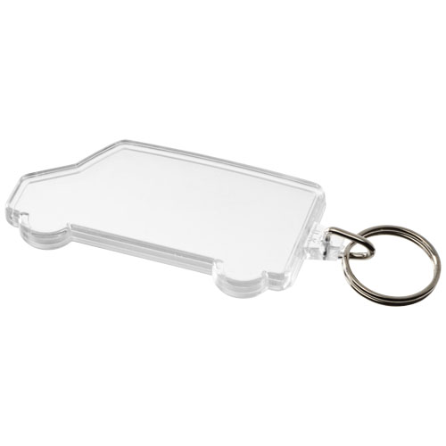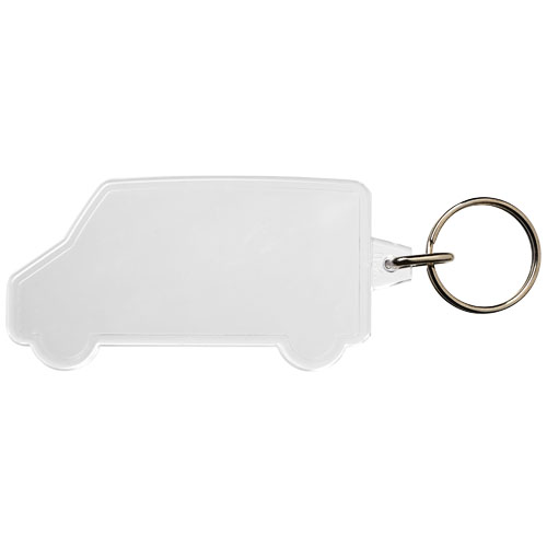 Clear varebilformet nøkkelkjede med nøkkelring i metall. Metalløkkeringen har en flat profil, noe som gjør den ideell for utsendelse. Utskriftsdimensjoner for innlegg 6,9 cm x 2,9 cm.
