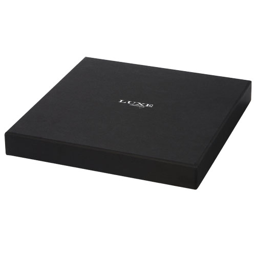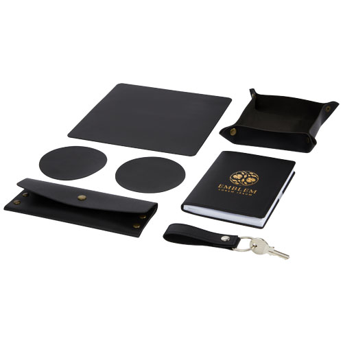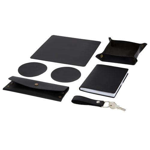 Luksuriøst kontorsett bestående av en pennepose, en notatbok, en musematte, en nøkkelholder, et sett med bordbeskytter og et brett for å oppbevare nøkler, mynter og småsaker. Pakket i en LUXE gaveeske.