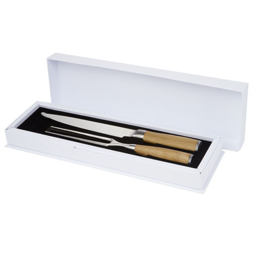 Kjøttkniv og -gaffel med bambushåndtak. Knivstørrelse 33,2 cm x 3,1 cm. Gaffelstørrelse 29,2 cm x 2,5 cm. Bambusen ble hentet og produsert etter bærekrafige standarder.