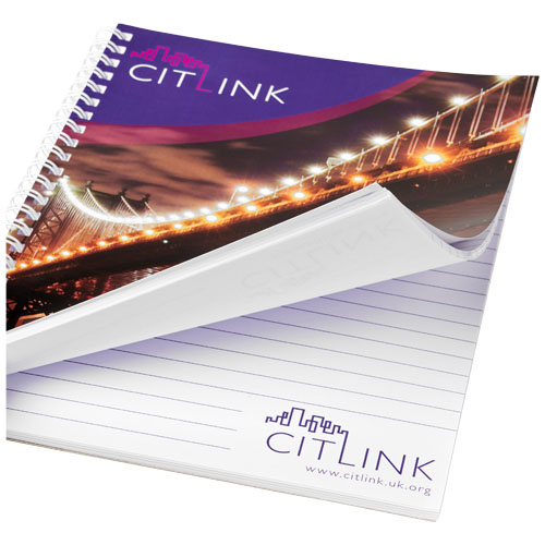 Desk-Mate R sirklet A4 notatbok med spiral. Denne notatboken inkluderer hvit eller svart spiral, glossy frontomslag i papp 250 g m og blankt papir 80 g m . Leveres standard med 50 ark, også tilgjengelig med 80 ark. Fullfargetrykk mulig på pappomslaget og alle sidene.