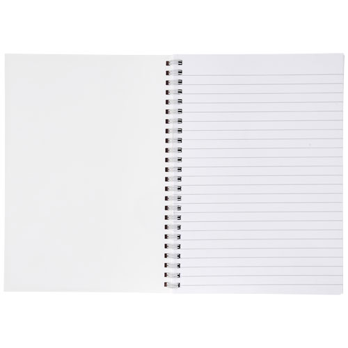 Desk-Mate R sirklet A4 notatbok med spiral. Inkluderer 50 blanke ark 80 g m og frontomslag 450 g m . Omslaget er rive- og vannbestandig. Sort eller hvit spiral. Fullfargetrykk mulig på både omslag og hvert ark.
