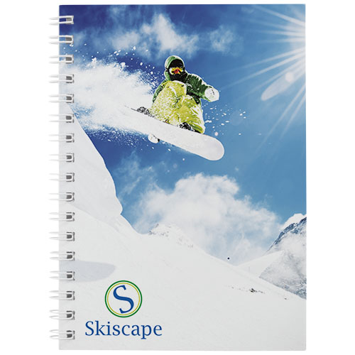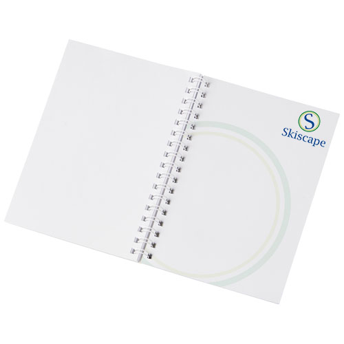 Desk-Mate R sirklet A6 notatbok med spiral. Inkluderer 50 blanke ark 80 g m og frontomslag 450 g m . Omslaget er rive- og vannbestandig. Sort eller hvit spiral. Fullfargetrykk mulig på både omslag og hvert ark.