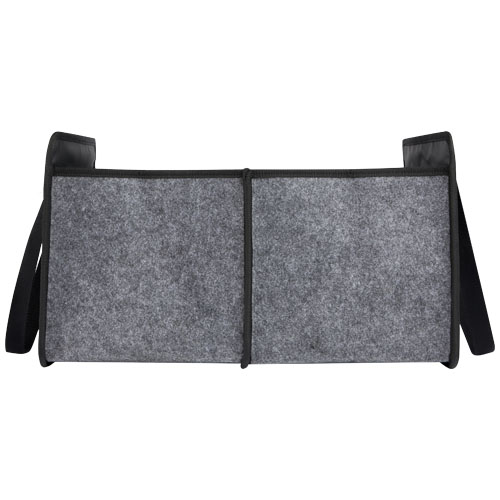 Sammenleggbar bagasjeromsorganisator laget av myk og slitesterk GRS sertifisert resirkulert filt av høy kvalitet. Har 2 store rom med forsterkede bunnplater, forlomme, nettinglomme og 2 lange vevde bomullshåndtak 30 x 2,5 cm . Ideell for å lagre ladekablene til elbilen, bære dagligvarer eller bare holde alt godt organisert i bilen eller hjemme. Brettes på plass uten anstrengelse, mens en elastisk stropp sikrer at den forblir pent foldet. Dybde lukket 4,5 cm. Dybde åpen 48 cm.