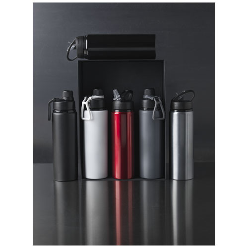 Enkeltvegget aluminiumsflaske med skrulokk og flip-top drikketut. Lokket har et håndtak for enkel bæring. BPA fri. Volum 800 ml.