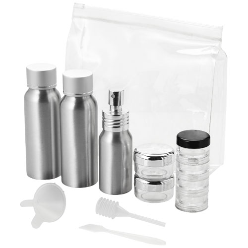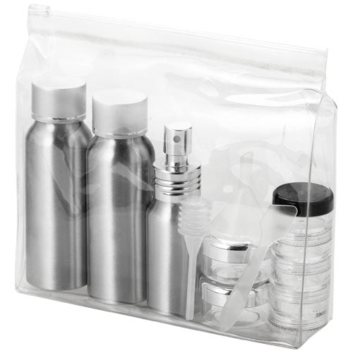 Inneholder 2 stk. 80 ml aluminiumsflasker, 1 stk. 30 ml aluminium sprayflaske, 2 stk. 0,5 ml krukker, 1 stk. krukke med 4 lag, en trakt, en spatel og en sugeflaske. Flasker, trakt osv. er pakket i polybag, leveres separat fra vesken. Dekorasjon er ikke mulig på delene.
