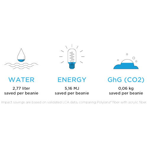 Bærekraftige lue med enkelt lag og dobbelbrettet kant. Loop-merket etikett. Polylana R sirklet-fiber er det laveffektive alternativet til 100 akryl- og ullfiber, som sparer vann, energi og reduserer CO2-utslipp i produksjons- og fargeprosessen. Sammenlignet med akrylfiber oppnås følgende besparelser for hver Polylana R sirklet fiberlue 2,77 liter vann, 5,16 MJ energi og 0,06 kg GhG CO2 . Konsekvensbesparelser er basert på validert Life Cycle Assessment LCA data.
