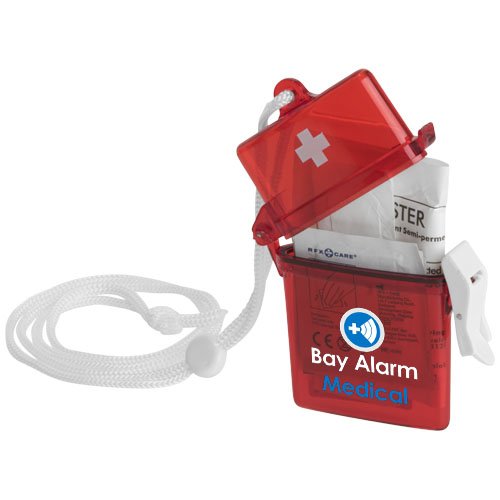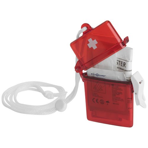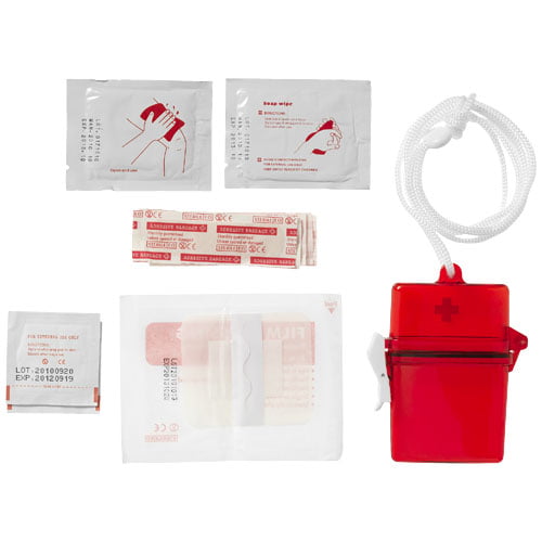 Gasskompress, 2 sårservietter, såpeserviett, våtserviett og 5 plaster i en gjennomsiktig rød boks med reim. Samsvarer med EN13485.