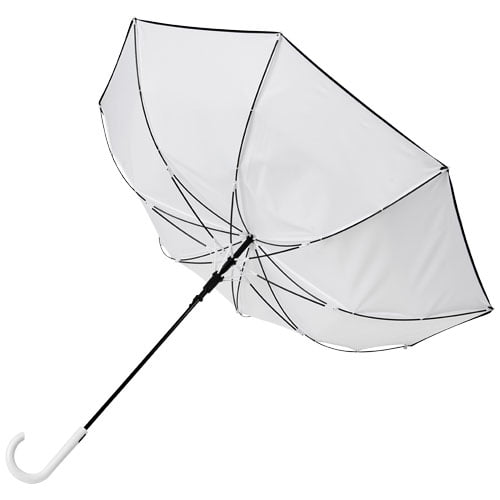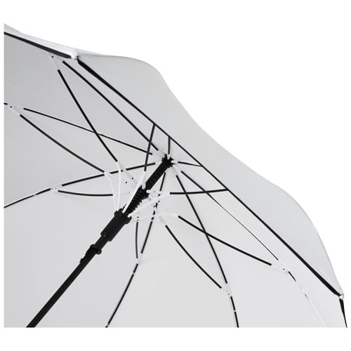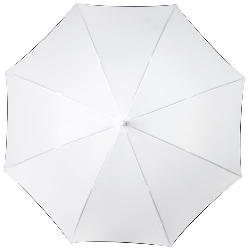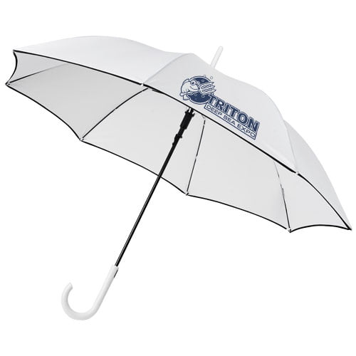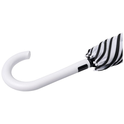 Paraply med automatisk åpning med en baldakin av kunstig polyester i friske farger. Solid metallskaft, en høykvalitets full glassfiberramme som gir maksimal fleksibilitet under vindfulle forhold. Det skjeve håndtaket har en integrert trykknapp. Fargede detaljer er tilgjengelige inne i glassfiberrammen, samt på håndtaket, tuppene og topplokket. Stort dekorasjonsområde tilgjengelig på hvert panel.