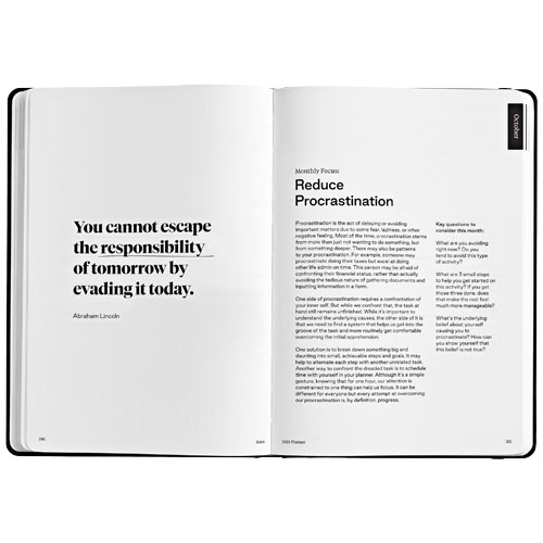 Karst R sirklet A5 kalender med dagsoversikt er et innoverende planleggersett som gjør det enkelt å holde oversikt over avtalene dine, samtidig som du kan jobbe med egenutvikling og personlige målsettinger. Dette kalendersettet består av to bind, som begge dekker seks måneder av året med 200 sider i glatt steinpapir. Kalenderen er designet med en dag per side, 12 månedlige motivasjonssitater for å hjelpe med egenutvikling, og plass til daglig målsetting, i tillegg til ukentlige og månedlige refleksjonsspørsmål. Indeksen gjøre det lett å organisere hverdagen, og sitatene med motiverende ord vil gi deg inspirasjon.