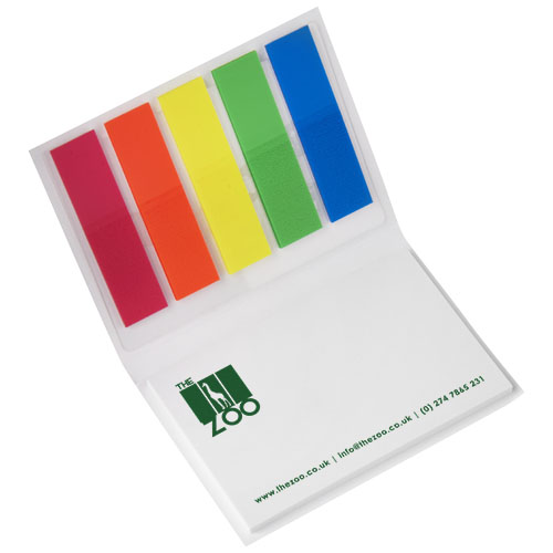 Kombinasjonen av Sticky-Mate R sirklet-klistrelapper og neonfargede sidemarkører skaper et nyttig produkt og et effektivt salgsfremmende verktøy. Omslag 350 g m2 . Inkluderer 25 ark 80 g m2 klistrelapper, størrelse 75x50mm. Inkluderer 5 sett med 20 neonfargede sidemarkører. Omslaget er digitalt trykket med glanset eller matt laminering.
