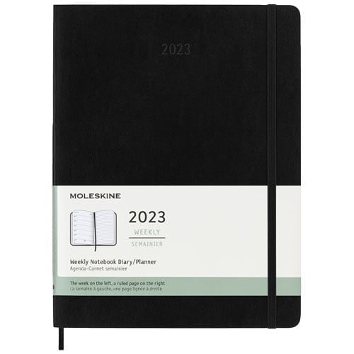 Moleskine kalender med ukesoversikt med mykt omslag for januar til desember 2023, formatert for å vise ukens avtaler til venstre og en side for notater og ideer til høyre. Har 70 g m elfenbensfarget syrefritt papir, svart elastisk lukking, sidebåndmarkør og en utvidbar innerlomme.