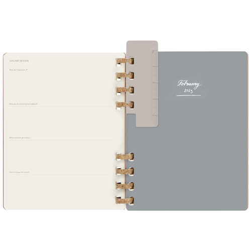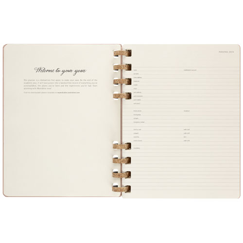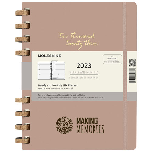 Moleskine XL planleggeren er en daglig venn for å organisere arrangementer fra januar til desember 2023. Innsiden har månedlige og ukentlige sider for langsiktige og daglige prosjekter. Det er også en del for å kartlegge og spore månedlige mål, en passordholder, avtakbare oppgavelister og sider for notatskriving og idemyldring. Med et hardt omslag laget av innovativt italiensk knust og nylaget papir, en fleksibel og robust spiralinnbinding laget av kork, elfenbensfarget 100 g m syrefritt papir, avrundede hjørner og elastisk lukking.