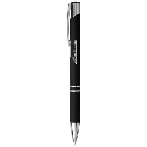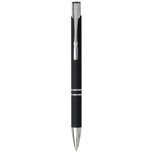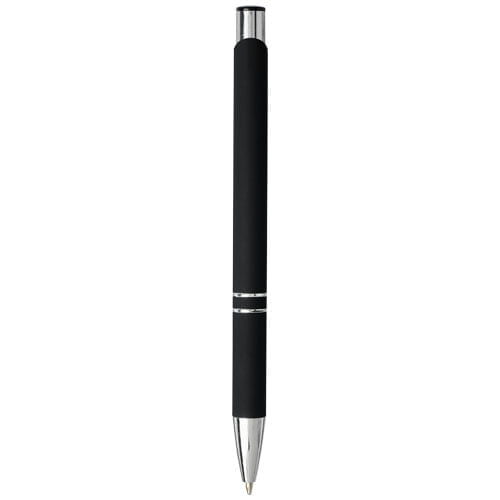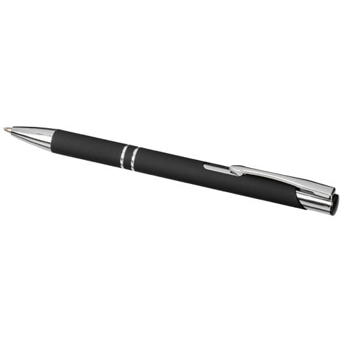 Gummibelegget gjør pennen myk å ta på, og når den er lasergravert vises pennens sølvunderlag. Kulepenn med klikkmekanisme, sort gummibelegg, kromtrimmer og svart ABS-topp. Den omfattende og populære Moneta-serien er tilgjengelig i mange forskjellige stiler og utførelser.