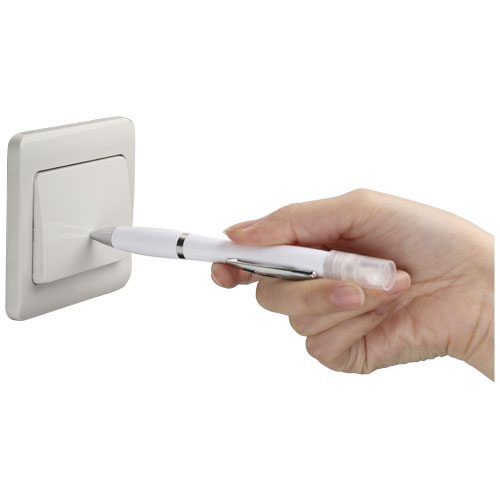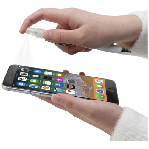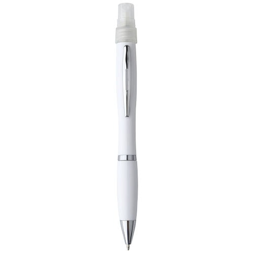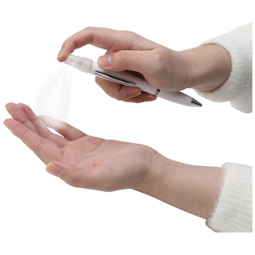 Kulepenn med påfyllbar beholder og beskyttelseshette på toppen. Sprayflasken kan fylles med alkohol eller annen rengjøringsvæske for å rense hender og eller desinfisere overflater mens du er på farten. Du skrur ganske enkelt av spraydysen for å fylle. Spraykapasitet 3 ml. Væske ikke inkludert.
