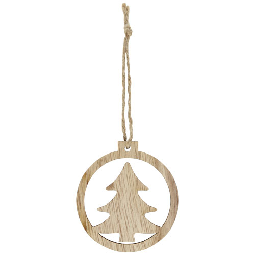 Rund trepynt med et tre på innsiden. Utstyrt med henger og ledning. Individuelt pakket med sekkepapir bak.