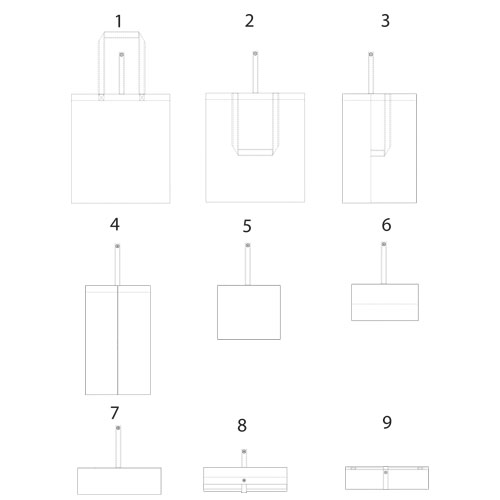 Handleveske med åpent hovedrom og fargede håndtak med en høyde på 32 cm. Stropp med knappelukking for å holde vesken brettet. Kan holde opptil 8 kg.