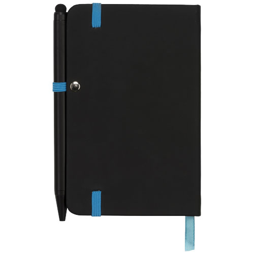 Moderne og stilig svart notisbok med mykt omslag. Med fargede kanter på arkene og sidemarkør i matchende farge, penneløkke og stropp. Leveres med enkel svart kule- og pekepenn. Med 96 kremfargede linjerte ark av 70 g-papir.