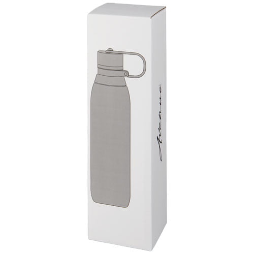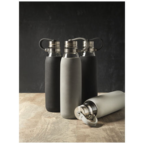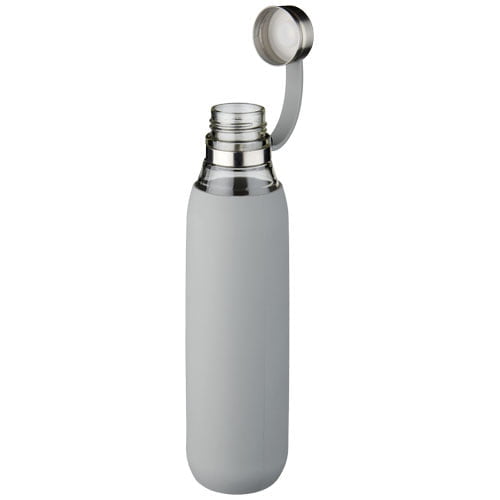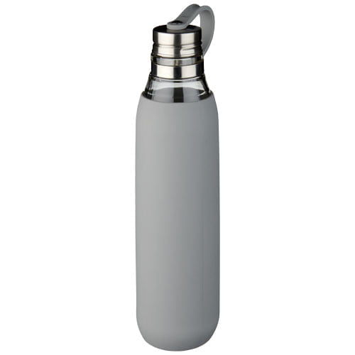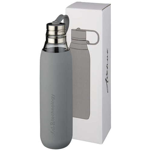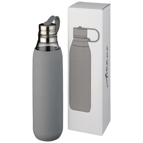 Glassflaske med enkeltvegg innpakket i et silikonetui med mykt grep og sklisikker bunn. Har et skrulokk og rustfritt stållokk med en komfortabel silikonhåndteringsløkke. Ikke frys, ikke bruk i mikrobølgeovn. Volumkapasiteten er 650ml. Presentert i en Avenue-gaveeske.