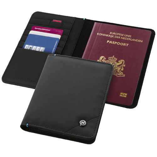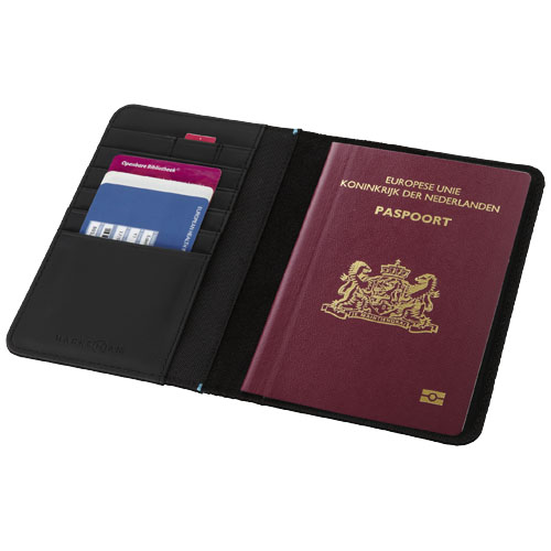 Kredittkort, pass og andre ID-kort har RFID-brikker. Dette passetuiet i eksklusiv design har et indre lag som blokkerer RFID-brikken. Passetuiet har seks kredittkortlommer, to oppbevaringslommer, en lomme til oppbevaring av SIM-kort og en lomme til pass. Leveres i en Marksman gaveeske. Tilbehør er ikke inkludert.
