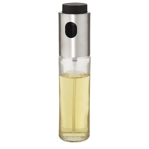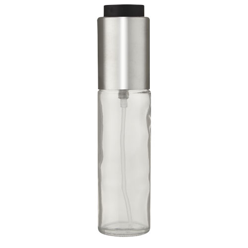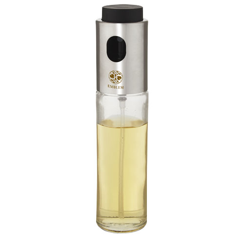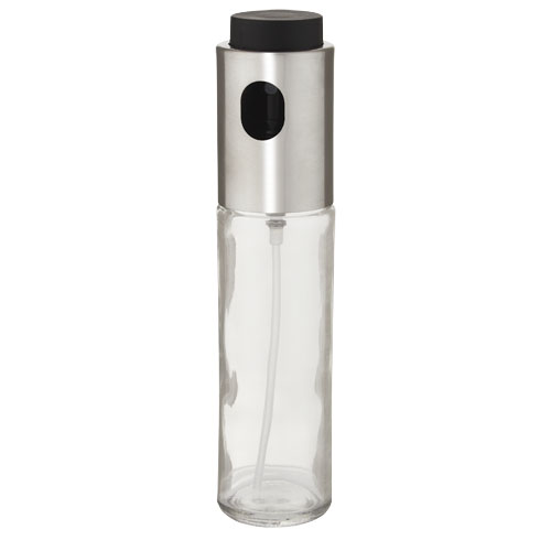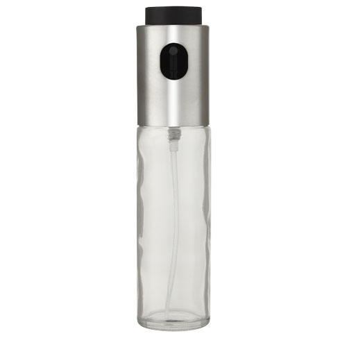 Oljespraybeholder for matlaging eller baking, laget av rustfritt stål og glass. Den har en stor trykknapp, noe som gjør det enkelt å kontrollere doseringen.