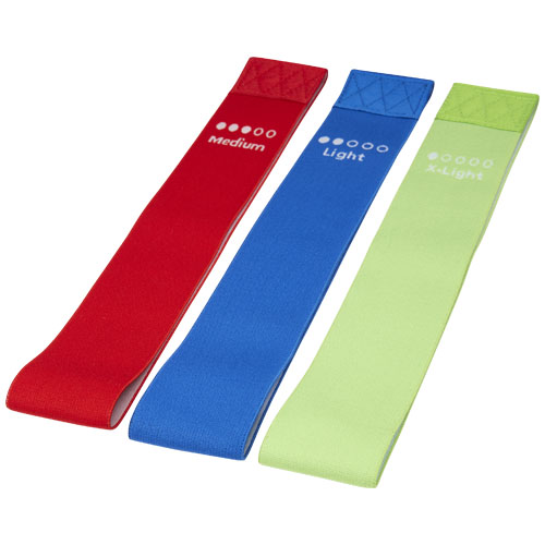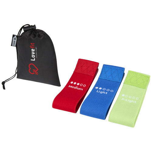 Et perfekt sett allround treningsbånd for menn og kvinner til hjemmetrening. Settet består av 3 lette motstandsbånd 60 x 5 cm med middels motstand, ideelt for trening av sete, ben, lår og magemuskler. Båndene er laget av myk polyester og har et komfortabelt, sklisikkert latekslag på innsiden, som sikrer et fast grep under trening. Settet leveres med en oppbevaringspose 20 x 10 cm laget av rPET, og som har fin dekorasjonsflate for logoplassering.