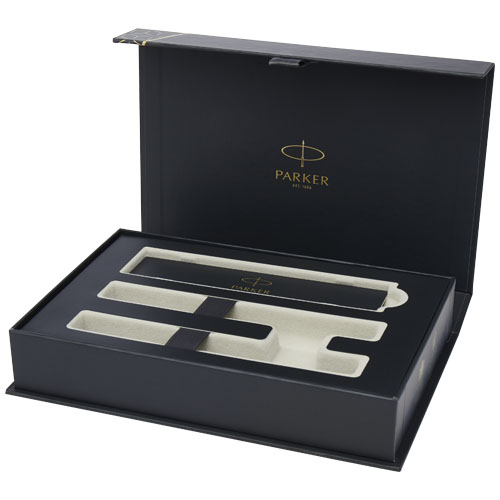 Gavesett med to penner bestående av en rollerpenn med svart blekk og en kulepenn med blått blekk. Med et moderne og stilig design, hever Parker stilen og den daglige skriveopplevelsen over mengden. Dette hverdagslige pennesettet gir god valuta for pengene, og er et første skritt inn i kategorien for penskrift. Eksklusivt design. Pakket i en gaveeske.