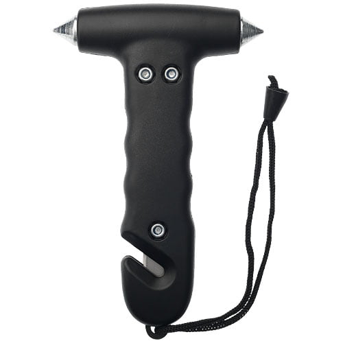 Nødhammer med håndleddstropp og innebygd beltekutter i håndtaket. To spisse vindusknusere i herdet stål og beltakutter kan brukes til å flykte dersom en uheldig situasjon skulle oppstå.