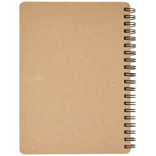 Notisbok med omslag av resirkulert papir og 60 linjerte, resirkulerte ark i A6-størrelse og en matchende penn. Notatbok og penn er i samme pakke.