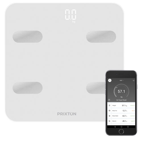 Vekt med 13 funksjoner for sporing via en app kroppsfett, kroppsvann, muskelprosent, beinmasse, BMR, BMI, visceralt fett, standardvekt, vektkontroll, fettmasse, fettfri masse. Programmet viser vekten i både kilo og pund. Integrert Bluetooth. Hvit LCD-skjerm. AAA-batteri. Maksimal vekt 180 kg.