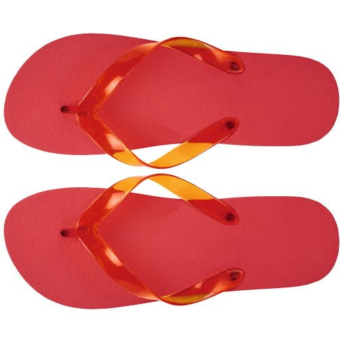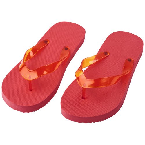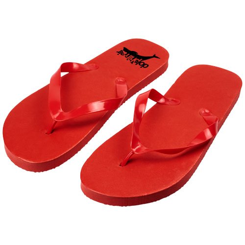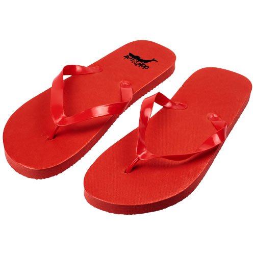 Sett med behagelige strandtøfler i et bredt spekter av farger med såle i polyeten og PVC-stropp. Leveres i to forskjellige størrelser M 36-38 og L 42-44. Dette er en velprøvd gave til sommersesongen. På grunn av produktets natur og bruk, blir anvendt logo utsatt for slitasje.