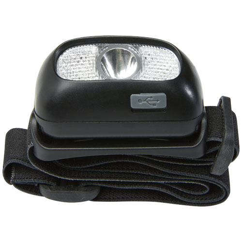 Med denne oppladbare, kraftige IPX 3-klassifiserte hodelykten går du aldri tom for batterier, ideell når du trenger litt lys under utendørsaktiviteter. Det komfortable polyesterhodebåndet er justerbart og har en ustrekt omkrets på 60 cm. Hodelykten er lett 58 gram og justerbar opp til en 45-graders vinkel. 3 W LED genererer 90 lumen for en belysningstid på 4,5 timer og har en stråleavstand på 100 meter. Den har også 2 røde LED-lys med 3 moduser høy middels lav . Det innebygde Litium-batteriet gir en kapasitet på 400 mAh. Leveres med bruksanvisning og er pakket i en resirkulert gaveeske av papp 7 x 6,5 x 5 cm .