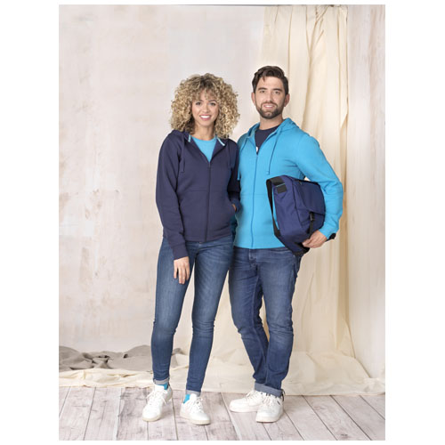Bærekraftige profilklær. GRS sertifisert glidelås foran. GOTS sertifisert snor i hetten. Kengurulomme. Børstet innside. Flatstrikkede mansjetter og nederkant. Tofarget halstape. Halvmåne. Merkelapp av transfer for god komfort.