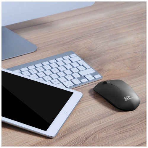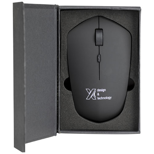 Oppladbar trådløs optisk mus med lysende logo og antibakteriell behandling. Logoen er lys når den er fulladet og blir mørkere når 20 av batteriet er igjen. USB-inngang -utgang 5V – 0,035 A. Kapasitet 400 mAh. DPI 800 1200 1600. Ladetid 3 timer. 1 meters USB-kabel er inkludert. Leveres med en gaveeske med magnetisk lukking, laget av resirkulert papir.
