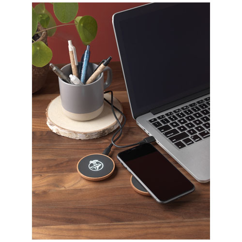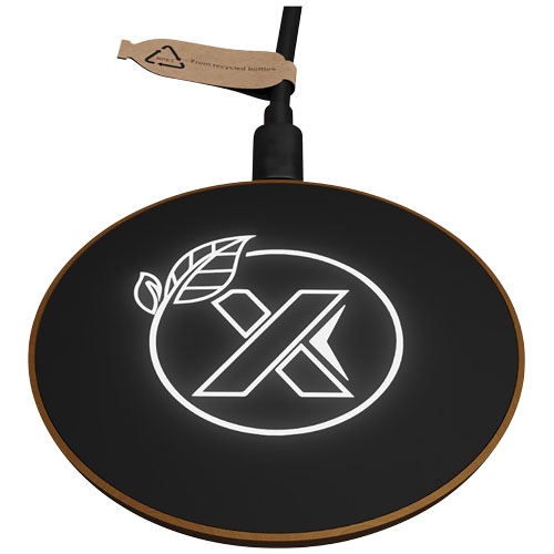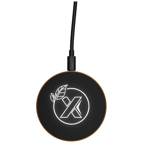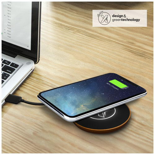 10W trådløs ladestasjon laget av gummi og tre samt ladekabel av resirkulert PET plast. Kan dekoreres med en lysende logo. Leveres i en svart gaveeske med magnetisk lukkemekanisme. Patent EUROPA EUIPO.