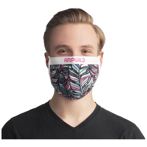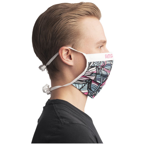 Fullfarge sublimasjon på 1 side. Bakside og bånd er hvite. Masken beskytter ikke mot smittestoffer, men brukes som en forebyggende hygienemaske. Produktet er ikke sterilt, og bør vaskes på 60 grader før bruk. Individuelt pakket enkeltvis i plast med vaskeinstruksjon. Stoffet samsvarer med ØKO-TEX test standarder.