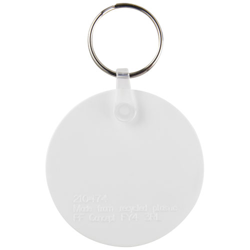 Hvit sirkelformet nøkkelring i metall. Produktetn har en flat profil, noe som gjør den ideell for utsendelse.