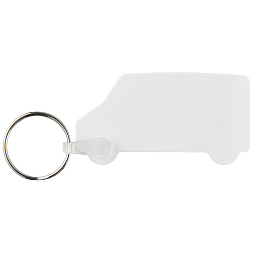 Hvit varebilformet nøkkelring i metall. Produktet har en flat profil, noe som gjør den ideell for utsendelse.