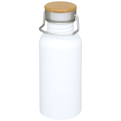 Enkeltvegget flaske i rustfritt stål med skrulokk. Lokket har en bambustopp, samt et håndtak for enkel bæring. Volum 500 ml. Leveres i gaveeske.