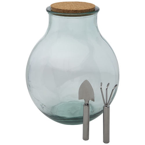 Terrarium hagesett av 100 resirkulert glass, med kork og hageverktøy av rustfritt stål. Et terrarium er som et akvarium, men for planter i stedet for fisk. Med dette kan du lage din egen miniatyrhage eller skog, innestengt i sin egen lille verden. Terrariumet er laget av resirkulerte glassflasker. Resirkulert glass produseres ved hjelp av mindre energi, råmateriale og tilsetningsstoffer, enn det som kreves for å lage tradisjonelt glass.