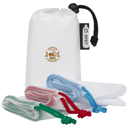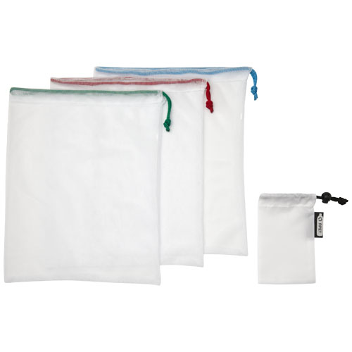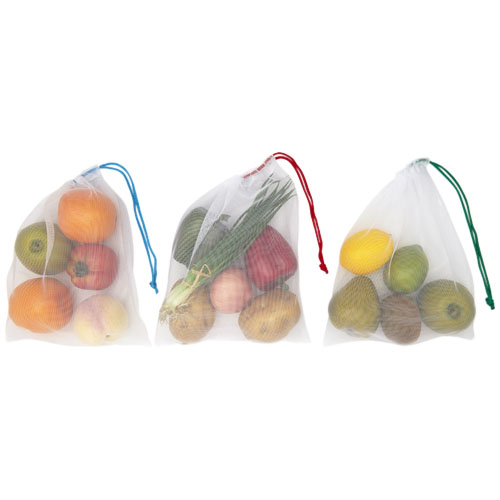 Sett med mesh nett. Nettene er gjenbrukbare og kan brukes til frukt eller grønnsaker som et alternativ til plastposer. Alle nettene har snørelukking.
