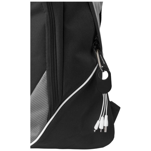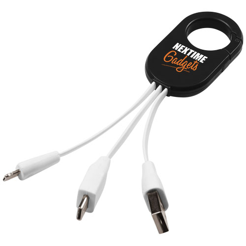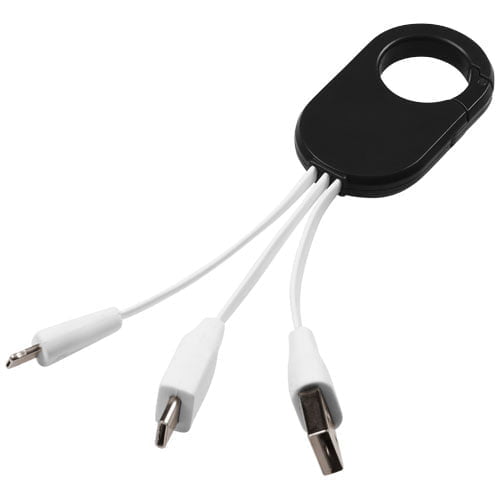 Troop 3-i-1-ladekabel inkluderer en USB C-tupp og en 2-i-1 dobbelt kompatibel tupp for både Apple R sirklet iOS- og Android-enheter. Den har en karabinkrok, så den enkelt kan festes til bagen din.