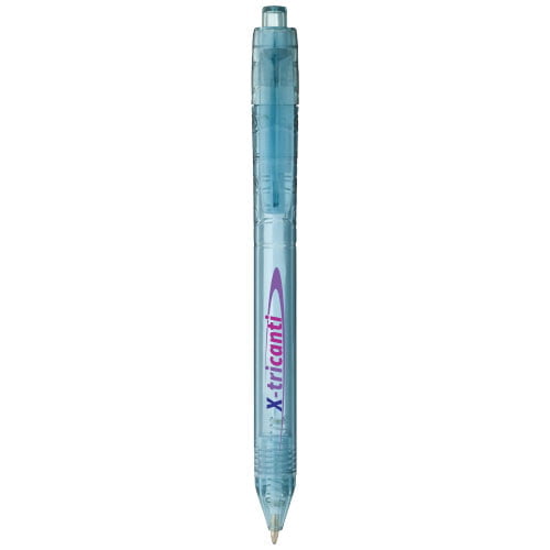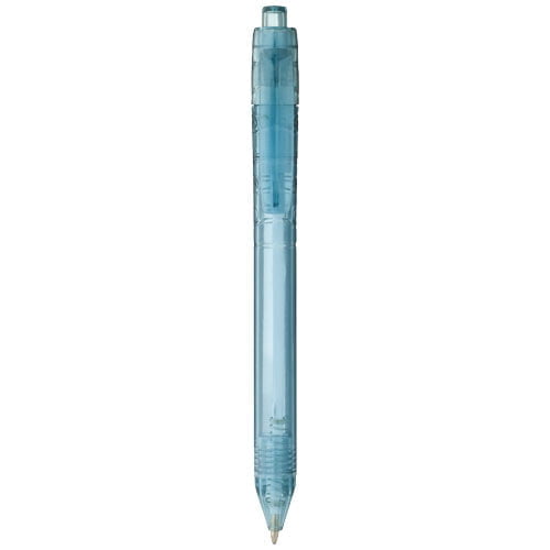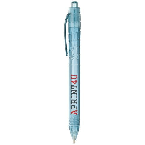 Kulepenn med klikkmekanisme og en gjennomsiktig sylinder. Sylinderen er laget av resirkulerte vannflasker, noe som bidrar til å redusere mengden av plastavfall.