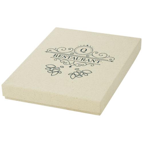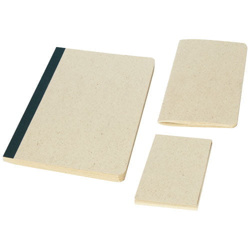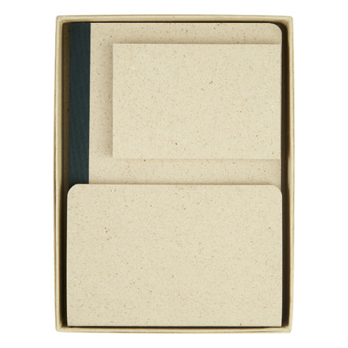 Papirgavesett bestående av en fleksibel 64 arks A5-notatblokk, et lite sydd hefte 10 x 15 cm og en notatblokk 8 x 11,5 cm . Alle 3 elementene er laget av 90 g m2 gresspapir som inneholder opptil 40 gressfibre og har en lav miljøpåvirkning. Mindre vann og energi brukes i produksjonsprosessen sammenlignet med vanlig papir, samtidig som det ikke brukes noen kjemikalier. Alle delene er produsert i Europa, noe som bidrar til et lavere karbonavtrykk.